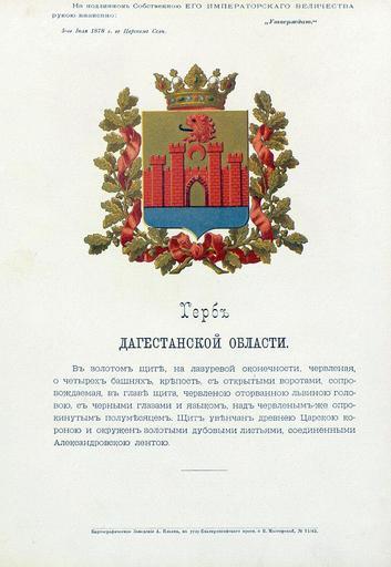 Keywords: Дагестанская область из Бенке.jpg Official Russian Empire coat of arms Dagestan Oblast Ге б Российской Импе ии Дагестанской области с официальным описанием в Ге бовнике Бенке Утве ждён Импе ато ом Все оссийским Александ ом Вто ым в 1878 году Ге бы губе ний и областей Российской Импе ии Отпечатано по аспо яжению минист а внут енних дел Санкт-Пете бу г Ка тог афическое заведение А А Ильина и типог афия инисте ства путей сообщения А Бенке 1880 / Scanned on paper album 1878 / 1880 published Russian Empire PD-old PD-RusEmpire PD-RU-exempt coats of arms <gallery> File Дагестанская область ВД Бенке jpg File Дагестанская область изд Сукачова JPG File Теми ХанШу а из Винкле а jpg File Coat of Arms of Dagestan oblast Russian empire png </gallery> <references/> Coats of arms of Dagestan Oblast Gerbovnik Benke