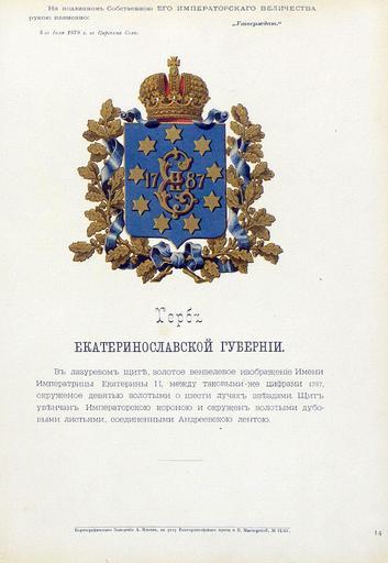 Keywords: Екатеринославская губерния из Бенке.jpg Official Russian Empire coat of arms Ekaterinoslav Governorate Гласный ге б Российской Импе ии Екате инославской губе нии с официальным описанием в Ге бовнике Бенке Утве ждён Импе ато ом Все оссийским Александ ом Вто ым в 1878 году Ге бы губе ний и областей Российской Импе ии Отпечатано по аспо яжению минист а внут енних дел Санкт-Пете бу г Ка тог афическое заведение А А Ильина и типог афия инисте ства путей сообщения А Бенке 1880 / Scanned on paper album 1878 / 1880 published Russian Empire PD-old PD-RusEmpire PD-RU-exempt coats of arms <gallery> File Екате инославская губ ВД Бенке jpg File Екате инославская губе ния изд Сукачова jpg File Екате инослав 1811 из Винкле а о игинал jpg File Coat of Arms of Yekaterinoslav Governorate png </gallery> Source <references/> Coats of arms of Ekaterinoslav Governorate Catherine's II of Russia imperial monogram Russian canting arms 9 six rays in heraldry Gerbovnik Benke