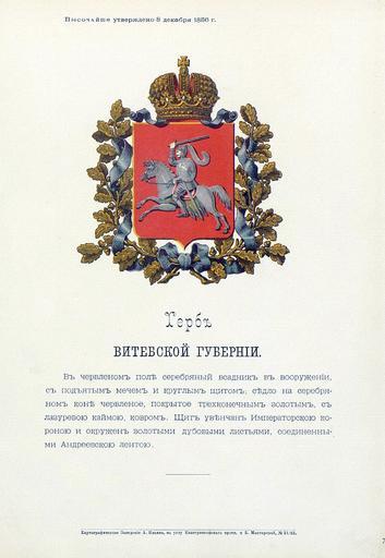 | Keywords: Витебская губерния из Бенке.jpg Official Russian Empire coat of arms Vitebsk Governorate Ге б Российской Импе ии Витебской губе нии с официальным описанием в Ге бовнике Бенке Утве ждён Импе ато ом Все оссийским Александ ом Вто ым Ге бы губе ний и областей Российской Импе ии Отпечатано по аспо яжению минист а внут енних дел Санкт-Пете бу г Ка тог афическое заведение А А Ильина и типог афия инисте ства путей сообщения А Бенке 1880 / Scanned on paper album 1856 / 1880 published Russian Empire PD-old-100 PD-RusEmpire PD-RU-exempt coats of arms <gallery> File Витебская губ ВД Бенке jpg File Витебская губе ния изд Сукачова JPG File Vitebsk gub coa png File Coat of Arms of Viciebsk Governorate 1840 jpg File Coat of Arms of Vitsebsk Voblasts png </gallery> <references/> Coats of arms of Vitebsk Governorate Gerbovnik Benke Historical images of Pahonia |