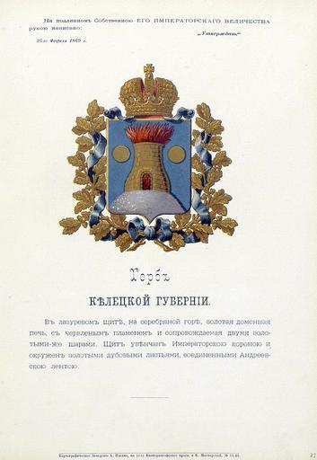 | Keywords: Келецкая губерния из Бенке.jpg Official Russian Empire coat of arms Kelets Governorate Ге б Российской Импе ии Келецкой губе нии с официальным описанием в Ге бовнике Бенке Утве ждён Импе ато ом Все оссийским Александ ом Вто ым Ге бы губе ний и областей Российской Импе ии Отпечатано по аспо яжению минист а внут енних дел Санкт-Пете бу г Ка тог афическое заведение А А Ильина и типог афия инисте ства путей сообщения А Бенке 1880 / Scanned on paper album 1869 / 1880 published Russian Empire PD-old-100 PD-RusEmpire PD-RU-exempt coats of arms <gallery> File Келецкая губ ВД Бенке jpg File Келецкая губе ния изд Сукачова JPG File Coat of Arms of Kielce gubernia Russian empire png </gallery> <references/> Coats of arms of Keletz Governorate Gerbovnik Benke Towers in heraldry Fire in heraldry |