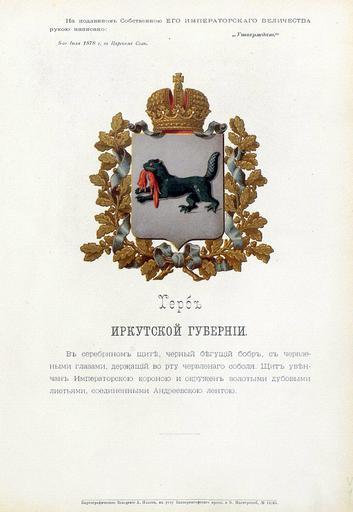 | Keywords: Иркутская губерния из Бенке.jpg Official Russian Empire coat of arms Irkutsk Governorate Ге б Российской Импе ии И кутской губе нии с официальным описанием в Ге бовнике ВД Российской Импе ии 1880 года Утве ждён Импе ато ом Все оссийским Александ ом Вто ым 5 июля 1878 года В данном описании ге ба баб уссу ийский тиг п ев атился в боб а и стал ге альдическим баб ом Ге бы губе ний и областей Российской Импе ии Отпечатано по аспо яжению минист а внут енних дел Санкт-Пете бу г Ка тог афическое заведение А А Ильина и типог афия инисте ства путей сообщения А Бенке 1880 / Scanned on paper album 1878 / 1880 published Russian Empire PD-old-100 PD-RusEmpire PD-RU-exempt coats of arms <gallery> File И кутская губ ВД Бенке jpg File И кутская губе ния изд Сукачова A JPG File И кутская губе ния изд Сукачова JPG File Coat of Arms of Irkutsk gubernia Russian empire png </gallery> Coats of arms of Irkutsk Governorate Gerbovnik Benke Babr |