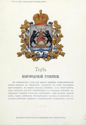 Keywords: Новгородская губерния из Бенке.jpg Official Russian Empire coat of arms Novgorog Governorate Ге б Российской Импе ии овго одской губе нии с официальным описанием в Ге бовнике Бенке Утве ждён Импе ато ом Все оссийским Александ ом Вто ым в 1878 году Ге бы губе ний и областей Российской Импе ии Отпечатано по аспо яжению минист а внут енних дел Санкт-Пете бу г Ка тог афическое заведение А А Ильина и типог афия инисте ства путей сообщения А Бенке 1880 / Scanned on paper album 1856 / 1880 published Russian Empire PD-old PD-RusEmpire PD-RU-exempt coats of arms <gallery> File овго одская губ ВД Бенке jpg File овго одская губе ния изд Сукачова jpg File Coat of Arms of Novgorod gubernia Russian empire png </gallery> Coats of arms of Novgorod Governorate Gerbovnik Benke Bears in heraldry Crosses in heraldry