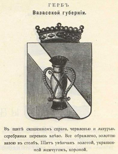 Keywords: Вазасская губ из Винклера.jpg Official Russian Empire Vaza Governorate coat of arms Гласный ге б Вазасской губе нии Российской Импе ии Великого Княжества Финляндского с официальным описанием в Ге бовнике Винкле а П П фон-Винкле Ге бы го одов губе ний областей и посадов Российской Импе ии внесенные в Полное Соб ание законов с 1649 по 1900 год Дозволено цензу ою С -Пете бу г 20 Июля 1899 года Издание книгото говца Ив Ив Иванова С -Пете бу г Типог афия И Комелова П яжка д 3 1899 \ Scanned by Vizu 1899 published П П фон Винкле \ Pavel von Vinkler PD-old-100 PD-RusEmpire Gerbovnik Vinklera - Governorate Oblast CoAs Charge of the house of Vasa in heraldry Coats of arms of Vaza Governorate Amphoras and ancient jugs in heraldry Russian canting arms Coats of arms of Province of Vaasa