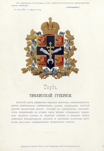 | Keywords: Тифлисская губерния из Бенке.jpg Official Russian Empire coat of arms Tiflis Governorate Ге б Российской Импе ии Тифлисской губе нии с официальным описанием в Ге бовнике Бенке Утве ждён Импе ато ом Все оссийским Александ ом Вто ым Ге бы губе ний и областей Российской Импе ии Отпечатано по аспо яжению минист а внут енних дел Санкт-Пете бу г Ка тог афическое заведение А А Ильина и типог афия инисте ства путей сообщения А Бенке 1880 / Scanned on paper album 1878 / 1880 published Russian Empire PD-old-100 PD-RusEmpire PD-RU-exempt coats of arms <gallery> File Тифлисская губ ВД Бенке jpg File Тифлисская губе ния изд Сукачова jpg File Ströhl-HA-LI-Fig 11 png File Coat of Arms of Tiflis governorate Russian empire png </gallery> <references/> Coats of arms of Tiflis Governorate Gerbovnik Benke Lions gules 1 crescent argent in heraldry Crosses in heraldry Hands in heraldry |