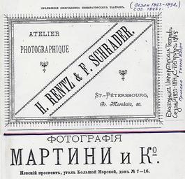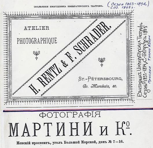 Keywords: "Ежегодник Императорских театров" сезон 1893 - 1894 годов.jpg ru Ежегодник Импе ато ских теат ов сезон 1893 - 1894 годов http //fotoshrader ru/wp-content/gallery/other/fotoatele-ezhegodnik-imperatorskix-teatrov-1895g jpg Ф ид их Людвиг Ге манович Ш аде 1895 г PD-old 19th-century photographers from Russia Trademarks of early photographers Magazines of Russia 1895 Bolshaya Morskaya street SPb Photostudio of A Renz F Schrader Photographer advertising 1895 Advertisements in Russia Magazines of Russia to be categorised by name |