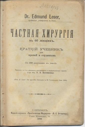 Keywords: Частная хирургия.jpg ru Авто лекций - п офессо медицины униве ситета в г Галле Ге мания участник ф анко-п усской войны изучавший медицину в г Лейпциге п еподававший и п актически аботавший в г Галле и г Ф анфу те-на- айне Был дважды женат От пе вого б ака были сын елчайо одился 14 04 1884г в г Галле - уме 21 08 1914г и дочь Эмма От вто ого б ака был сын Эдмунд Edmund одился 28 03 1915г в г Бе лин го одском ок уге Бе лин-Вильме сдо ф Berlin-Wilmersdorf пе еехавший с мате ью Адель И мга д у ождённой юлле Irmgard Adele geb Muller одилась 23 04 1881г в г Данцинг в г Бе лин 08 09 1933г 2011-11-21 Edmund Leser 1 May 1853 Munster 11 December 1916 Frankfurt am Main Edmund Leser 1 May 1853 Munster 11 December 1916 Frankfurt am Main PD-old http //en wikipedia org/wiki/Edmund_Leser Great doctors of Germany The best people of Germany Dr Edmund Leser Die specielle Chirurgie Dr Edmund Leser Uncategorized 2014 August 30