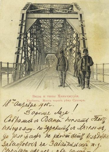| Keywords: Виды и типы Маньчжурии. Харбин. Мост через реку Сунгари.jpg ru Отк ытка Виды и типы аньчжу ии - Ха бин ост че ез еку Сунга и Отп авлена п едположительно из И кутска 18 октяб я 1905 г п апо щиком 9-го ев опейского ст елкового полка П Ф Сми новым Почтовая отк ытка Отк ытое письмо - Carte Postale Всемi ный почтовый союзъ Россiя Rosenfeld Sohtscholoko Авто неизвестен скани овано И Е Алексеевым 8 янва я 2012 г До 18 октяб я 1905 г п едположительно 1903 г PD-old Chinese Eastern Railway | ||||