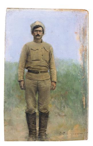 Keywords: Иван Павлович Похитонов - Мой охранник Иван, Красной гвардии.jpg Artwork Creator Ivan Pokhitonov ой ох анник Иван К асной гва дии Mon gardien le garde-rouge Ivan 1919 oil panel cm 13 3 8 2 object history Provenance Boris Wulfert Pokhitonov ; Gifted by the above's son John Wulfert Pokhitonov to the father of the present owner credit line signed 'I Pokhitonow ' lower right ; with inscription and number ' No 498/'Ivan - le garde rouge'/ à Goratchi Klioutch pres sic Ekaterin/en 1919' on the reverse accession number Christie's online 5146227 PD-old-auto 1923 Ivan Pokhitonov Portrait paintings of men 1919 paintings from Russia |