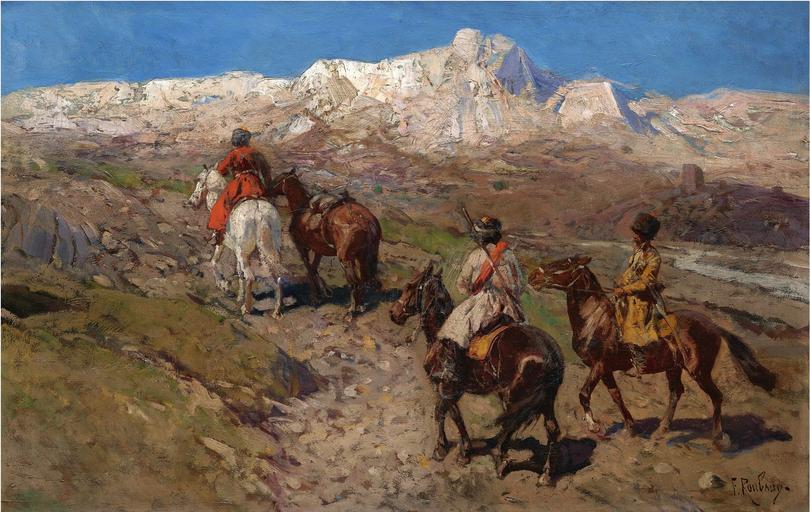 | Keywords: Франц Рубо - Казаки.jpg Artwork Creator Franz Roubaud Cossacks oil canvas cm 52 75 object history credit line signed in Latin l r accession number http //www sothebys com/de/catalogues/ecatalogue html/2008/russian-paintings-l08113 /r /de/ecat fhtml L08113 html+r m /de/ecat lot L08113 html/132/ Sotheby's PD-old-auto 1928 Franz Roubaud Paintings of Cossack men on horseback Images from Sotheby's | ||||