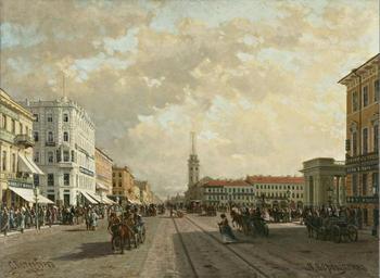 | Keywords: Пётр Петрович Верещагин - Вид Невского проспекта в Санкт-Петербурге.jpg Newski-Prospekt in Sankt Petersburg A view of Nevsky Prospekt in St Petersburg Вид евского п оспекта в Санкт-Пете бу ге oil canvas cm 40 53 object history credit line accession number http //www arcadja com/auctions/en/private/verescagin_petr_petrovic/artworks/45395/0/ Hagelstam auctions Helsinki via arcadja com PD-art-100 Paintings by Petr Petrovich Vereshchagin Paintings of Saint Petersburg Nevsky Prospekt in art | ||||