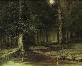 Keywords: Юлий Юльевич Клевер (после того, как) - Взгляд в лесу в сумерках.jpg after de Ein Blick in den Wald während der Dämmerung en A look into the forest at dawn oil canvas cm 45 7 55 9 object history credit line LangSwitch Signed lower left in Cyrillic Подпись слева внизу accession number http //fineart ha com/c/item zx saleNo 5008 lotNo 79025 Heritage Auctions PD-old-auto-1923 1924 DEFAULTSORT Julius von Klever A look into the forest at dawn Julius von Klever Landscape paintings from Russia Paintings of woodland streams Images from Heritage Auctions