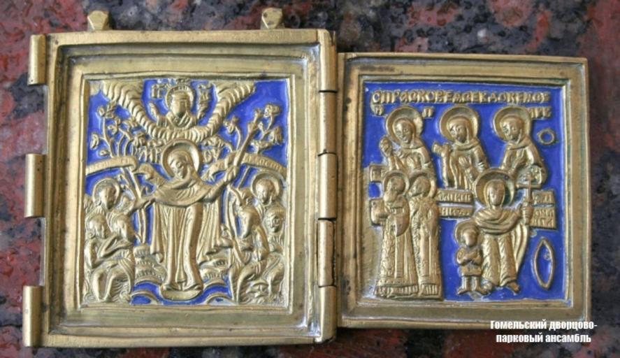 | Keywords: Богоматерь всех скорбящих радость.jpg ru две ство ки т ехство чатого складня с изоб ажением «Богомате ь Всех Ско бящих адость» и «Изб анные святые» П едметы дати уются II половиной XIX века и п едставляют собой медное литье ук ашенное цветными эмалями II half of XIX cent http //www palacegomel by/index php newsid 104 author watermark Custom license marker 2013 04 06 PD-old Uploaded with UploadWizard Collections of the Rumiancaŭ-Paskievič Palace Joy of All Who Sorrow 19th-century icons of Belarus 19th-century works in Belarus Skladen |