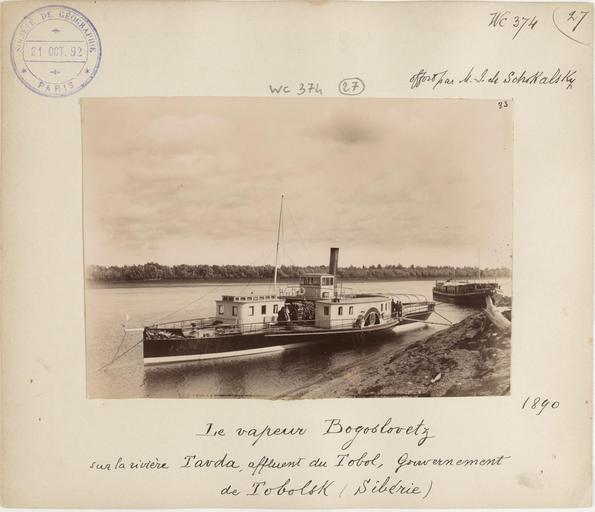 | Keywords: Пароход Богословец.jpg ru Па оход Богословец на еке Тавда впадающей в Тобол 1890 Ф анцузское геог афическое общество Шокальский Юлий ихайлович Custom license marker 2014 05 28 PD-old Uploaded with UploadWizard Yuly Mikhailovich Shokalsky Steamships of Russia Sidewheel riverboats 1890 photographs Tavda River |