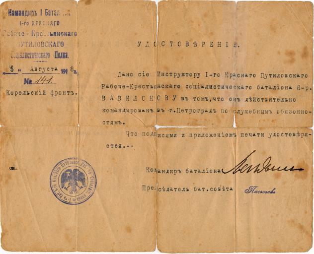 Keywords: Удостоверение инструктора Путиловского батальона 05.08.1918.jpg ru Удостове ение инст укто а 1-го к асного Путиловского абоче-к естьянского социалистического батальона от 05 августа 1918 года с печатью соде жащей изоб ажение двуглавого о ла 2012-02-12 17 30 13 о игинал документа авто неизвестен PD-old-70-1923 Emblems of the Russian Republic Kirov Plant factory Saint Petersburg |