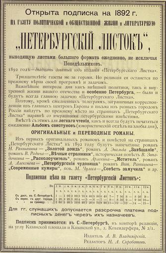 | View Original: | Реклама_газеты_Петербургский_листок,_1892.jpg (2796x4272) | |||