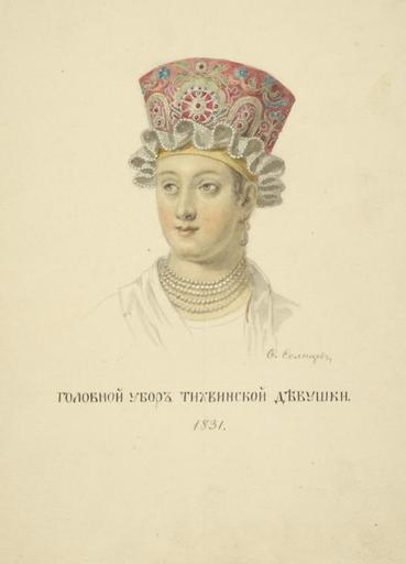 View Original:Солнцев_Головной_убор_тихвинской_девушки_1831.jpg (738x1024)
