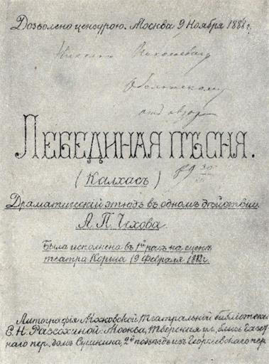 | Keywords: Лебединая песня (Калхас) литографированный оттиск 1888.jpg ru Лебединая песня Калхас литог афи ованный оттиск 1888 г 1888 http //apchekhov ru/books/item/f00/s00/z0000025/st004 shtml Литог афия осковской теат альной библиотеки Е Рассохиной ценз аз 9 нояб я 1888 г other versions Custom license marker 2015 12 23 PD-old-100 Anton Pavlovich Chekhov Uploaded with UploadWizard | ||||