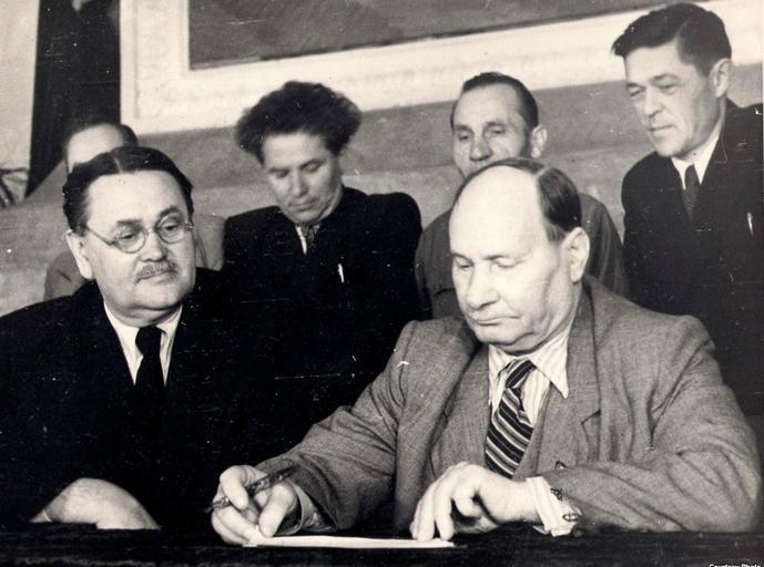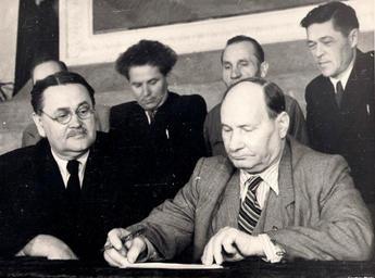 Keywords: Я. Колас і В. Купрэвіч.jpg Васіль Куп эвіч падпісваюць Стакгольмскі заклік 1950 Фонды Бела ускага дзя жаўнага акадэмічнага музея літа ату ы і мастацтва author Custom license marker 2012 10 26 PD-Belarus Yakub Kolas Uploaded with UploadWizard Vasily Feofilovich Kuprevich