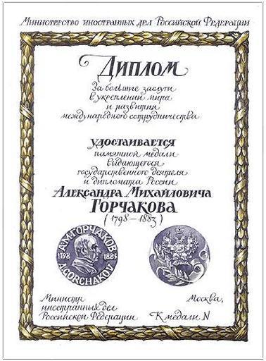 | Keywords: Диплом к медали Горчакова 1.jpg ru Памятная медаль А Го чакова Диплом ст 1 Certificate of the Alexander Gorchakov medal awarded by Russian Ministry of Foreign Affairs http //www mid ru/nsite-sv nsf/b3d4f4566a00e34343256cc4003a99fd/ee690ec3abfd889e43256cc5003ec0a1 OpenDocument ИД России 1997 год PD-RU-exempt Awards of Russia Alexander Mikhailovich Gorchakov Ministry of Foreign Affairs Russia | ||||