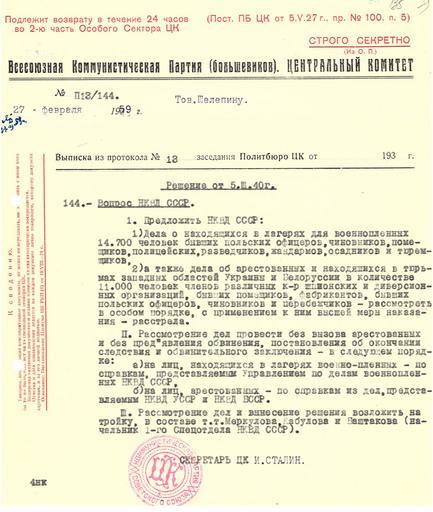 Keywords: Выписка из протокола № 13 заседания Политбюро ЦК ВКП(б) «Вопрос НКВД СССР» (пункт 144). 5 марта 1940 г. Экземпляр, направленный председателю КГБ.jpg Выписка из п отокола 13 заседания Политбю о ЦК ВКП б «Воп ос КВД СССР» пункт 144 5 ма та 1940 г Экземпля нап авленный п едседателю КГБ п и С СССР А Шелепину 27 фев аля 1959 г Подлинник РГАСПИ Ф 17 Оп 166 Д 621 Л 135 http //rusarchives ru/publication/katyn/spisok shtml via http //echo msk ru/doc/675406-echo html 1940 Политбю о ЦК PD-RU-exempt Katyń Massacre 28 April 2010 Documents |