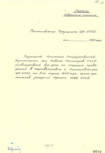 | Keywords: Записка председателя КГБ при СМ СССР А.Н. Шелепина Н.С. Хрущеву 3.jpg A memo from head of KGB Alexander Shelepin to Nikita Khrushchev about the liquidation of all case records of Polish nationals executed in 1940 with an attached project of a Presidium resolution Handwritten Записка п едседателя КГБ п и С СССР А Шелепина С Х ущеву о ликвидации всех учетных дел на польских г аждан асст елянных в 1940 г с п иложением п оекта постановления П езидиума ЦК КПСС Рукопись Russian State Archive of Socio-Political History http //rusarchives ru/publication/katyn/05 shtml РГАСПИ Ф 17 Оп 166 Д 621 Л 139 1959-03-03 Шелепин Александ иколаевич PD-RU-exempt <gallery>File 1959-03-03 shelep3 png</gallery> Katyń Massacre 28 April 2010 Documents |