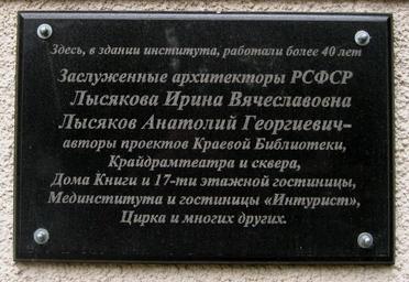 MAKE A MEME View Large Image Мемориальная доска архитекторам И. В. Лысяковой и А. Г. Лысякову.jpg А Г Лысякове на здании в кото ом  асполагался институт «Став ...