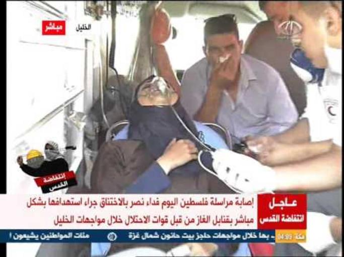 | Keywords: فداء نصر مصابة.jpg ar فداء عبد الفتاح نصر مُراسلة صحفية فلسطينية من مدينة دورا التابعة لِمحافظة الخَليل، تعمل حالياً كمُراسلة إخبارية لِفَضائية فلسطين اليوم فِي جنوب الضفة الغربية 2016-05-10 https //www flickr com/photos/142912543 N02/ الصُور مُرفوعة على موقع فليكر، وَمُرخصة تحت التخصيص للملك العام محمد فداء other versions cc-zero People of Palestine |
