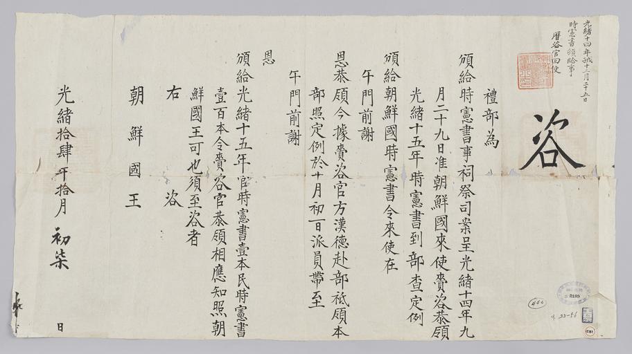 | Keywords: 조선-청 외교문서(자문) 045.jpg ko 鮮 差來領時憲書뢰咨官方漢德에게 15年官曆壹 民曆百 頒給事를 禮部 移咨12 25日復命 2016-07-18 http //www nl go kr/nl/search/SearchDetail nl category_code ct service KOLIS vdkvgwkey 1129979 colltype DAN_OLD place_code_info 172 place_name_info EB 94 94 EC A7 80 ED 84 B8 EC 97 B4 EB 9E 8C EC 8B A4 manage_code MA shape_code B refLoc null category srchFlag Y h_kwd E5 8F A4 E6 9C 9D51- EB 8B A428-56 lic_yn N mat_code RB 국립중앙도 조선국왕 수급 청국예 급 other versions PD-Art Books from National Library of Korea Books from Korea 1888 in Relations of the Joseon Dynasty and the Qing Dynasty |