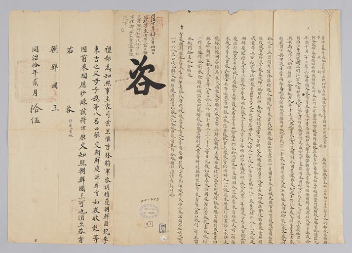 Keywords: 조선-청 외교문서(자문) 300.jpg 고종 8년 1871 2월 15 에 청국 예 에 조선국왕에게 보내 온 문 해 국경 넘어 도둑질하다 잡힌 조선 동길 吉 모 자 등 8명 경원 慶源 넘긴다고 알리는 내용 다 2016-07-19 http //www nl go kr/nl/search/SearchDetail nl category_code ct service KOLIS vdkvgwkey 1130411 colltype DAN_OLD place_code_info 172 place_name_info EB 94 94 EC A7 80 ED 84 B8 EC 97 B4 EB 9E 8C EC 8B A4 manage_code MA shape_code B refLoc null category srchFlag Y h_kwd E5 8F A4 E6 9C 9D51- EB 8B A428-383 lic_yn N mat_code RB 국립중앙도 조선국왕 청국예 other versions PD-Art Books from National Library of Korea Books from Korea 1871 in Relations of the Joseon Dynasty and the Qing Dynasty |