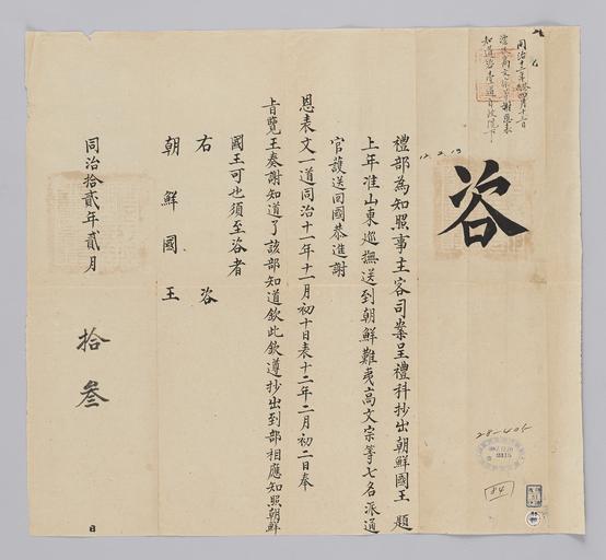 Keywords: 조선-청 외교문서(자문) 321.jpg ko 고종 10년 1873 2월 13 에 청국 예 에 조선국왕에게 보내 온 문 번에 산동 山 방에 류 민 고문종 등 7명 호송하여 국 것에 해 조선국왕 올린 사 를 황 에게 올렸 알리는 내용 다 2016-07-19 http //www nl go kr/nl/search/SearchDetail nl category_code ct service KOLIS vdkvgwkey 1130358 colltype DAN_OLD place_code_info 172 place_name_info EB 94 94 EC A7 80 ED 84 B8 EC 97 B4 EB 9E 8C EC 8B A4 manage_code MA shape_code B refLoc null category srchFlag Y h_kwd E5 8F A4 E6 9C 9D51- EB 8B A428-405 lic_yn N mat_code RB 국립중앙도 조선국왕 청국예 other versions PD-Art Books from National Library of Korea Books from Korea 1873 in Relations of the Joseon Dynasty and the Qing Dynasty |