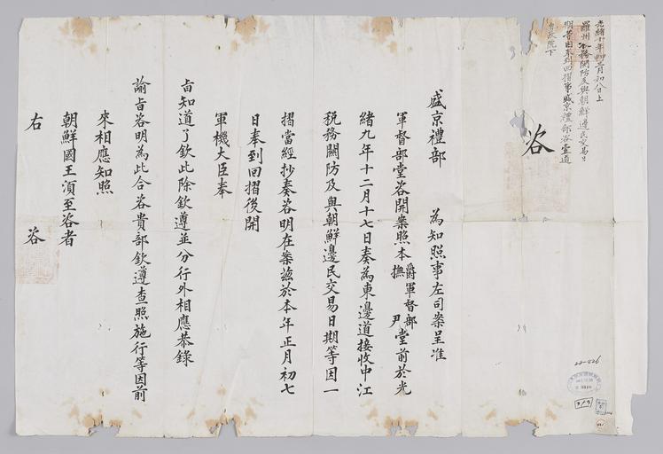 | Keywords: 조선-청 외교문서(자문) 331.jpg 고종 21년 1884 에 청국 예 에 조선국왕에게 보내 온 문 나주 羅州 세무 방 稅務 防 과 조선 민 교역 자를 황 에게 아뢰었다고 알리는 내용 다 문 뒷 분 결 되어 정확 작성 기는 알 수 없다 2016-07-19 http //www nl go kr/nl/search/SearchDetail nl category_code ct service KOLIS vdkvgwkey 1130221 colltype DAN_OLD place_code_info 172 place_name_info EB 94 94 EC A7 80 ED 84 B8 EC 97 B4 EB 9E 8C EC 8B A4 manage_code MA shape_code B refLoc null category srchFlag Y h_kwd E5 8F A4 E6 9C 9D51- EB 8B A428-426 lic_yn N mat_code RB 국립중앙도 조선국왕 청국예 other versions PD-Art Books from National Library of Korea Books from Korea 1884 in Relations of the Joseon Dynasty and the Qing Dynasty |