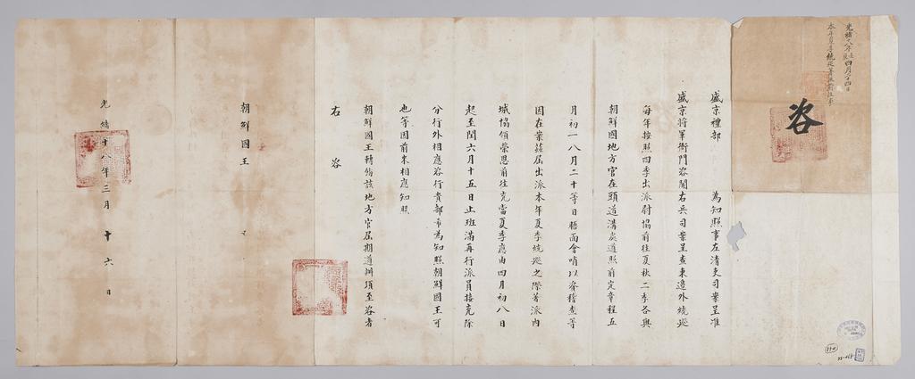 | Keywords: 조선-청 외교문서(자문) 337.jpg 고종 29년 1892 3월 16 에 청국 예 에 조선국왕에게 보내 온 문 올해 하계 통 에 내성 협령 영 榮恩 파견 다고 알리는 내용 다 통 기는 4월 8 터 6월 15 까 다 2016-07-20 http //www nl go kr/nl/search/SearchDetail nl category_code ct service KOLIS vdkvgwkey 1130278 colltype DAN_OLD place_code_info 172 place_name_info EB 94 94 EC A7 80 ED 84 B8 EC 97 B4 EB 9E 8C EC 8B A4 manage_code MA shape_code B refLoc null category srchFlag Y h_kwd E5 8F A4 E6 9C 9D51- EB 8B A428-465 lic_yn N mat_code RB 국립중앙도 조선국왕 청국예 other versions PD-Art Books from National Library of Korea Books from Korea 1892 in Relations of the Joseon Dynasty and the Qing Dynasty |