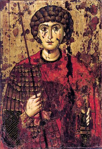 Keywords: Київська ікона, XI ст. Успенський собор Московського Кремля. ...Близькими за часом створення, пластично-лінійним вирішенням і монументально-епічним характером до "Богоматері Великої Панагії" є ікони великих розмірів - "Георгій-воїн", "Димитрій Солунський", "Благовіщення". Ікона "Георгій-воїн", ймовірно, створена як храмова для георгіївського собору - патронального храму Ярослава Мудрого. Храм освятив митрополит Іларіон у 1051 р. Створення ікони св. Георгія варто віднести до середини XI ст., де епічність, монументальність, масивність постаті мають відповідність в образному ладі Софії Київської. ... В образі воїна простежуються глибокі патріотичні ідеї Іларіона, що знайшли втілення у його "Слові про закон і благодать". Тому Георгій в іконі поданий не мучеником, а ідеальним воїном, сповненим оптимізму і мужності. Його образ став наче емблемою князювання Ярослава. Д.П. Крвавич, В.А. Овсійчук, С.О. Черепанова - Українське мистецтво, т.2, Львів, "Світ", 2004. - с. 156, іл. 204.