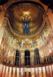 Keywords: Софія Київська, XI ст. Мозаїка у центральній апсиді. Центр мозаїчних композицій становить головна апсида. Величаве зображення Богородиці (5,45 м) - найбільше у давньоруському мистецтві, виступає на суцільному золотому тлі. Її мафорій* просякнутий золотими променями (золото - символ божественного світла і безмежного простору). Богородиця панує над центральною навою, уособлюючи "церкву земну" та заступницю перед Пантократором. У середньому поясі апсиди - велика монументальна композиція - "Євхаристія". По центру обабіч престолу з киворієм** стоять ангели з рипідами***, і Христос у двох іпостасях причащає апостолів, які підходять до нього справа та зліва, хлібом і вином, перетвореними чудесним способом у тіло і кров Христову. Апостоли зображені на золотому тлі без позему, що створює ілюзію безмежного простору. Вони ніби пронизані наскрізь світлом, перебуваючи в містичній атмосфері літургійного дійства, яке їх цілковито захопило величчю духовної радості. * мафорій - покривало заміжніх жінок; ** киворій - купол над престолом, що підноситься на колонах; предмет для зберігання святих дарів; *** рипіди - променеві кола, опахала, віяла. Д.П. Крвавич, В.А. Овсійчук, С.О. Черепанова - Українське мистецтво, т.2, Львів, "Світ", 2004. - с. 145, іл. 181 |
