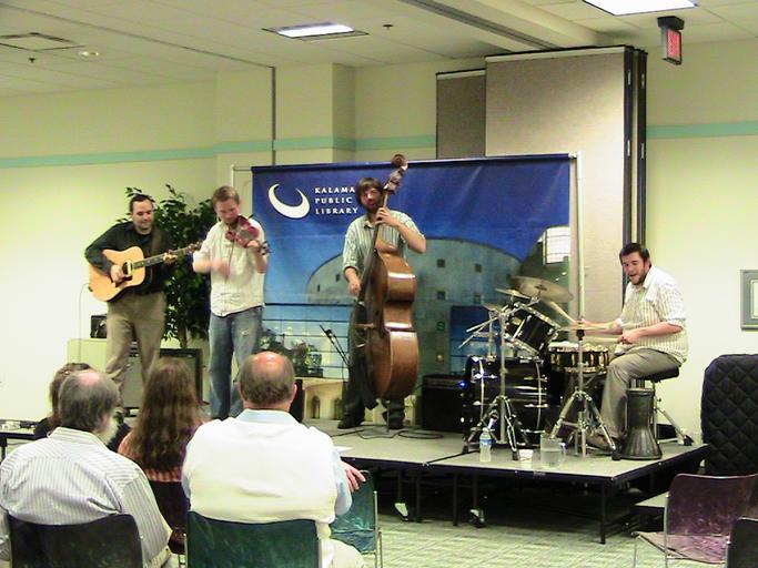 Keywords: kalamazoo library live concert liveconcert folk bluegrass jazz celtic indie State champion bluegrass fiddler Brad Phillips, national award-winning jazz percussionist Mike Shimmin, national champion soloist jazz bassist Andrew Kratzat, and title-defying-creative-mastermind-insert­-adjective-here guitarist Jesse Lee Mason share an active interest in jazz. Millish performed at Kalamazoo Public Library on May 13, 2009, as part of the library's Live Music @ KPL series. www.kpl.gov/music/ State champion bluegrass fiddler Brad Phillips, national award-winning jazz percussionist Mike Shimmin, national champion soloist jazz bassist Andrew Kratzat, and title-defying-creative-mastermind-insert­-adjective-here guitarist Jesse Lee Mason share an active interest in jazz. Millish performed at Kalamazoo Public Library on May 13, 2009, as part of the library's Live Music @ KPL series. www.kpl.gov/music/