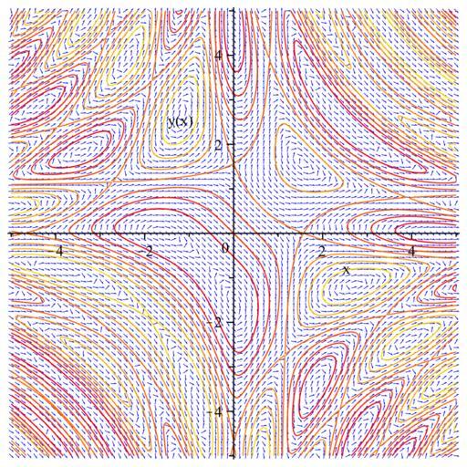 | Keywords: Implicit Function Theorem.svg Demonstration of the Implicit Function Theorem The curves are the implicitly defined as <math>f x y \sin x+y -\cos xy C</math> with various values of the constant <math>C</math> The background slope field shows that if one is given a point on the curve then one can in principle generate a local piece of the curve defined as an explicit function of x or at least approximate it by tracing from slope field e g approximation by Euler's method which can be made as accurate as desired by choosing small step size; as step size approaches zero the result matches the actual local piece of curve more accurately Own 2008-05-08 Saran T Vector fields Implicit curves |