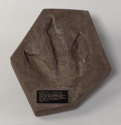 Keywords: Impression of a Dinosaur Trace Fossil Footprint - NARA - 7787788.jpg Scope and content This artifact is a fiberglass replica of an impression of a 200 million-year-old Eubrontes giganteus dinosaur track that was discovered in 1970 in a Roseland New Jersey quarry by two high school students The impression was given as a gift by the students Paul Olsen and Anthony Lessa to President Richard Nixon in 1972 General notes 7787788 Local identifier D 1972 4467 President 1969-1974 Nixon White House Gift Unit 01/20/1969 - 08/09/1974 Richard Nixon Library LP-RN 18001 Yorba Linda Boulevard Yorba Linda CA 92886 Record group Collection RN-MUS Richard Nixon Presidential Library Museum Collection 1913 - 1994 Record group ARC 2734809 Domestic Gifts Received by President Richard Nixon and Mrs Patricia Nixon compiled 1969 - 1974 Series ARC 2734829 File unit File unit ARC Variant control numbers Other Identifier 17225 This is the NARA internal exhibit tracking number Other versions Other pages NARA-cooperation PD-USGov Dinosaur footprints in the United States Eubrontes |