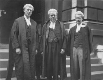 | Keywords: law lawyers wigs gowns privy council privycouncil london blackandwhite monochrome black and white Group photograph of the Right Honourable J.L. Ilsley, K.C., Cyril F.H. Carson, and L.G. Goodenough standing outside the Privy Council entrance on Downing Street, London, England. The photograph was taken on the occasion of the hearing of the Attorney General for Saskatchewan, Attorney General of Canada, and the Mortgage Loans Association regarding the Farm Security Act of Saskatchewan. Date: 13 July 1948 Photographer: unknown Reference code: 991001-01P Group photograph of the Right Honourable J.L. Ilsley, K.C., Cyril F.H. Carson, and L.G. Goodenough standing outside the Privy Council entrance on Downing Street, London, England. The photograph was taken on the occasion of the hearing of the Attorney General for Saskatchewan, Attorney General of Canada, and the Mortgage Loans Association regarding the Farm Security Act of Saskatchewan. Date: 13 July 1948 Photographer: unknown Reference code: 991001-01P |