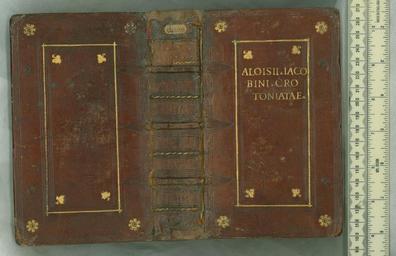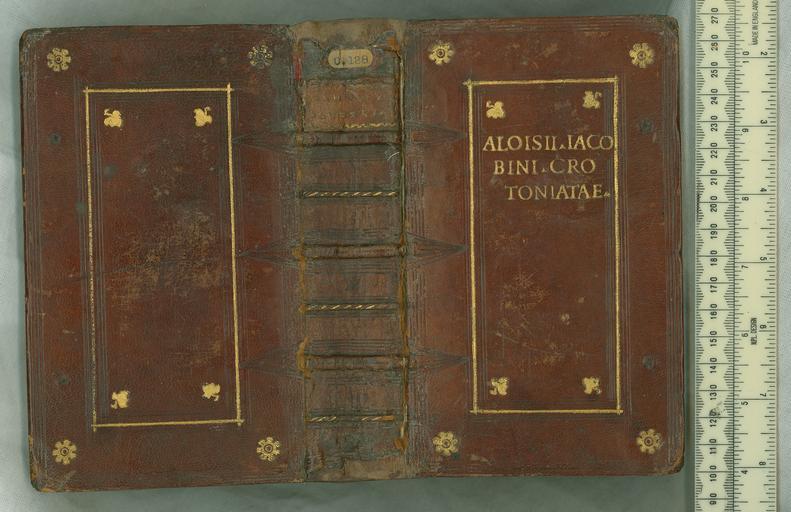 Keywords: -in Greek- - Upper and lower cover and spine (C128b3).jpg Style Panel design Lettered cover eg intitals titles; Caption Upper and lower cover and spine; Colour Red; Edge Blue exhibition history Decorative Technique Tooled in blind Tooled in gold; Cover Material Goatskin includes morocco turkey etc May be Venice binding by Andrea di Lorenzo Check All edges coloured maybe blue Ink ms note author written on tail edge of text block Unusual endleaves of white paper sprinkled with blue and red 3 spine bands and 4 half bands Traces of 2 pairs of ties the name Aloisius Jacobinus from Crotone possibly Luigi Iacobini/Jacobini ™ from Crotone has been tooled in gold on the cover object history Text 1534; Unspecified; Jacobini object type Cc-zero place of creation Binding Italy place of discovery Macchi Atlante della Legatura Italiana 2007 tav 72-76 British Library image http //www bl uk/catalogues/bookbindings/LargeImage aspx RecordId 020-000018004 ImageId ImageId 56847 Copyright BL in Greek Uploaded with GWToolset in Greek - Upper and lower cover and spine C128b3 http //www webarchive org uk/bldatasets/bindings/c128b3 jpg Bookbinding 16th-century bookbinding British Library Bookbindings |