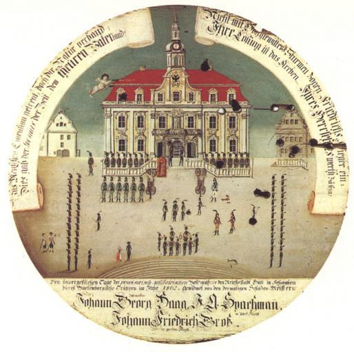 | Keywords: Inbesitznahme der Reichsstadt Hall.jpg en Shooting target from 1802 or 1803 showing Württemberg soldiers parading in front of the town hall of Schwäbisch Hall Württemberg peacefully occupied and annexed that city in 1802 Like nearly all the other free Imperial cities Hall lost its independence in the course of the German mediatization of 1802-1803 <br> de Inbesitznahme der Reichsstadt Hall durch württembergisches Militär Schützenscheibe der Schützenmeister Johann Georg Haag J G Spaehmann und Johann Friedrich Groß zeigt Rathaus und Marktplatz 1802 <br> Inschrift Was Menschen Eigensinn getrent; doch die Natur verband; Dies gab der Genius der Zeit “ dem theuren Vaterland Nicht mit Hochgewitters Stürmen zogen Friedrichs Krieger ein Ihre Losung ist das Streben “ Ihres Herrschers werth zu sein ø 61 5 cm Keckenburgmuseum Schwäbisch Hall Abb 98 in Acht Jahrhunderte Stadtgeschichte - Vergangenheit und Gegenwart im Spiegel der Kommunalarchive in Baden-Württemberg ISBN 3-7995-4036-9 1802 Author Public Domain PD-old-100 History of Schwäbisch Hall 1802 Painted targets |