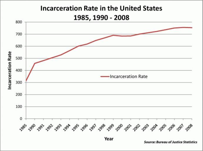 | Keywords: Incarceration Rate in the United States 1985,1990-2008.gif A graph made in Excel 2007 showing the incarceration rate in the United States from 1985 1990 - 2008 The incarceration rate is defined as the total number of inmates held in custody of state or federal prisons or local jails per 100 000 U S residents http //bjs ojp usdoj gov/content/pub/pdf/p08 pdf p16 It was made using data provided by the Bureau of Justice Statistics en File Incarceration Rate in the United States 1985 1990-2008 png en User Smallman12q created the PNG version of this graph using the following sources For 2000-2008 I used http //bjs ojp usdoj gov/content/pub/pdf/p08 pdf Prisoners in 2008 NCJ 228417 Appendix Table 1 on page 16 For 1985 1990-1999 the data came from http //www albany edu/sourcebook/pdf/section6 pdf section 6 of Sourcebook of criminal justice statistics 2003 page 488 Table 6 13 The sources for that page are as follows Prison and Jail Inmates at Midyear 1998 Bulletin NCJ 173414 Washington DC U S Department of Justice March 1999 p 2 Table 1 U S Department of Justice Bureau of Justice Statistics Prisoners in 2002 Bulletin NCJ 200248 p 2 and 2003 Bulletin NCJ 205335 p 2 Table 1 Washington DC U S Department of Justice 21 55 8 January 2010 UTC - date of original PNG version of the image Smallman12q talk created the PNG version of the graph User Timeshifter converted it to this GIF file en File Incarceration Rate in the United States_1985 1990-2008 pdf The data is as follows made using excel2wiki 1 cellspacing 0 center style background f0f0f0; Year center style background f0f0f0; Incarceration Rate - 1985 313 - 1990 458 - 1991 481 - 1992 505 - 1993 528 - 1994 564 - 1995 601 - 1996 618 - 1997 648 - 1998 669 - 1999 691 - 2000 684 - 2001 685 - 2002 701 - 2003 712 - 2004 723 - 2005 737 - 2006 751 - 2007 756 - 2008 754 - Smallman12q Imprisonment and detention rates in the United States |