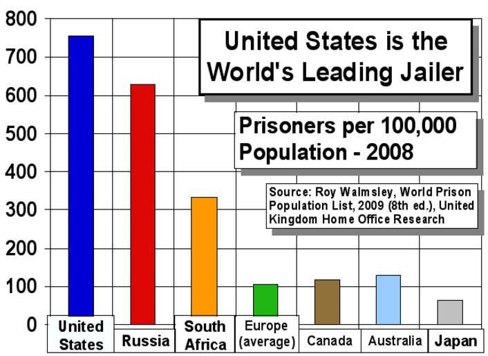 | Keywords: Incarceration rates worldwide.gif graph Selected incarceration rates worldwide The stats source is the World Prison Population List 8th edition http //www scribd com/destinyschildren/d/25301071-World-Prison-Population-List-2008 PDF file By Roy Walmsley Published in 2009 International Centre for Prison Studies School of Law King's College London See also the latest data here http //prisonstudies org/info/worldbrief/wpb_stats php World Prison Brief Compare many nations Select from menu prison population totals prison population rates highest to lowest percentage of pre-trial detainees / remand prisoners within the prison population percentage of female prisoners within the prison population percentage of foreign prisoners within the prison population and occupancy rates See also en List of countries by incarceration rate http //www november org/graphs/LeadingJailer gif See date on chart November Coalition http //www november org <br> Sentence with November org contact info removed from the bottom of the chart by User Timeshifter See Commons Watermarks See license information section below http //www november org/graphs is a November Coalition page with charts That page says These graphs are in the public domain http //www november org/graphs The November Coalition Imprisonment and detention rates Bar charts |