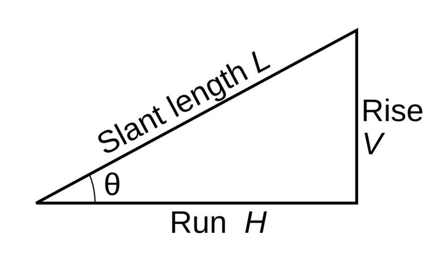Keywords: Inclined plane terminology.svg en Diagram showing terminology used in describing inclined planes The horizontal length is called the Run The difference in height between bottom of plane and top is called Rise The length of the ramp itself is often called slant length 2012-09-08 02 35 15 own Chetvorno cc-zero Uploaded with UploadWizard Inclined planes |