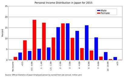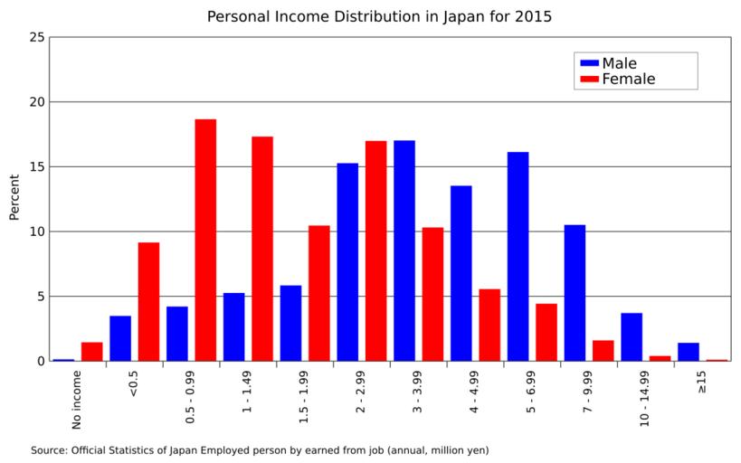 | Keywords: Income distribution in Japan by sex.svg  translate yes en Income distribution in Japan by sex in 2015 Japan has one of the greatest gender gaps in the world Data source Ministry of Internal Affairs and Communications 2016-05-26 own Delphi234 other versions current annually cc-zero Income distribution Economy of Japan Gender gap |
