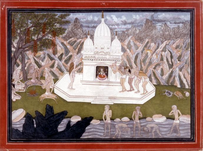 Keywords: Indian - Ascetics Before the Shrine of the Goddess - Walters W859.jpg The five pilgrims are shown engaged in three different activities following the continuous mode of visual narration that has remained a favorite of Indian artists for over two millennia In the foreground they bathe in a river; having cleansed their bodies they pay obeisance to the goddess in the temple; finally they sit in a group below a flowering tree and in the warmth of an improvised fire they say their prayers Each ascetic called sadhaka devotee or siddha empowered in the text has a distinctive physiognomy rendered with convincing naturalism Realistic touches are also evident in the manner in which the garments and rosaries are strewn on the ground and in the depiction of the fire indicative of intense cold at the isolated shrine high in the mountains Indeed the iciness of the atmosphere is further conveyed by the prominent use of cold pastel tones and stark white which gain in intensity from the jutting charcoal gray rocks in the water the patch of green and the orange flowering vines dangling from the tree early Other date century 19 pigments paper cm 36 5 49 2 accession number W 859 26869 John and Berthe Ford Baltimore date and mode of acquisition unknown Walters Art Museum John Berthe Ford 2001 place of origin Kangra Himachal Pradesh India Walters Art Museum license 2D Hindu art in the Walters Art Museum Media contributed by the Walters Art Museum needs category review Hindu sages 19th-century watercolor paintings from India Paintings of India in the Walters Art Museum Rivers of India in art Religious buildings of India in art |