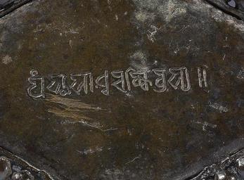 | Keywords: Indian - Bodhisattva Maitreya - Walters 543080 - Mark A.jpg This sumptuous bodhisattva is the future Buddha Maitreya recognizable by the small pot resting on the lotus stem and by the stupa nearly hidden in his elaborate headdress Solid dome-shaped structures called stupas sometimes hold relics of the Buddha Shakyamuni It can be imagined that Maitreya is honoring Shakyamuni by placing his relics on his head Originally the sculpture flanked a statue of Shakyamuni with the bodhisattva Avalokiteshvara on the other side An inscription on the base names the elderly monk Sadhurakshita donor of this image to a monastery century 12 bronze with silver and copper inlay cm 18 4 14 7 6 accession number 54 3080 843 John and Berthe Ford Baltimore date and mode of acquisition unknown Walters Art Museum John Berthe Ford 2009 under base place of origin Bihar India Walters Art Museum license Art of India in the Walters Art Museum Media contributed by the Walters Art Museum needs category review |