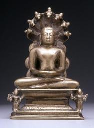 | Keywords: Indian - Jina Parshvanatha with Attendants - Walters 543013.jpg This image portrays the Jina Parshvanatha who is distinguished from the other twenty-three Jinas of the Jain pantheon by the seven-hooded snake that forms a canopy over his head Otherwise he does not differ from the others and typically is an impassive naked figure seated in the classic posture of meditation with his hands placed on his lap in a gesture of contemplation dhyanamudra The nudity of the figure indicates that the donor unnamed in the dedicatory inscription belonged to the Digambara sky-clad order of Jainism which predominates in Karnataka Parshvanatha is one of the twenty-four Jinas or liberated teachers worshipped by the Jains Various tutelary and protective divinities of both sexes are also worshipped but they are subservient to the twenty-four Jinas Hence two such deities are represented here as diminutive figures standing in attendance in front of the tiered base The male on the Jina's right is Dharana and the female opposite is Padmavati Although called yaksha and yakshi rather than deva or devi like the Hindu or Buddhist deities they have multiple limbs and are venerated in a similar fashion 1589 brass cm 22 2 accession number 54 3013 17363 John and Berthe Ford Baltimore date and mode of acquisition unknown Walters Art Museum John Berthe Ford 2002 Inscr effaced Desire and Devotion Art from India Nepal and Tibet in the John and Berthe Ford Collection The Walters Art Museum Baltimore; Birmingham Museum of Art Birmingham; Santa Barbara Museum of Art Santa Barbara; Albuquerque Museum Albuquerque 2001-2003 place of origin Karnataka India Walters Art Museum license Art of India in the Walters Art Museum Media contributed by the Walters Art Museum needs category review Parshvanatha |