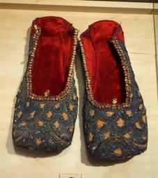 Keywords: Indian mojari, 19th century, red velvet with gold embroidery and sequins - Bata Shoe Museum - DSC00132.JPG en Exhibit in the Bata Shoe Museum Toronto Ontario Canada This item is old enough so that its design is in the public domain The museum permitted photography without restriction 2013-07-04 10 22 56 own Daderot cc-zero Shoes in the Bata Shoe Museum Uploaded with UploadWizard Footwear of India Velvet shoes |