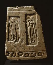 Keywords: Indian - Tile with Human Figures - Walters 482867.jpg This is a floor tile from a Buddhist monastery Joined with other tiles it made an enclosing circle The male figure is a guardian The graceful woman in the see-through dress holding a vase is most likely a river goddess suggesting prosperity century 4 5 terracotta cm 47 6 36 8 6 4 accession number 48 2867 36398 William Wolff Gallery New York New York date and mode of acquisition unknown John and Berthe Ford Baltimore April 1974 by purchase Walters Art Museum John Berthe Ford 2010 Desire and Devotion Art from India Nepal and Tibet in the John and Berthe Ford Collection The Walters Art Museum Baltimore; Birmingham Museum of Art Birmingham; Santa Barbara Museum of Art Santa Barbara; Albuquerque Museum Albuquerque 2001-2003 The Arts of Kashmir Asia Society New York 2007-2008 place of origin Harwan Kashmir India Walters Art Museum license Art of India in the Walters Art Museum Media contributed by the Walters Art Museum needs category review
