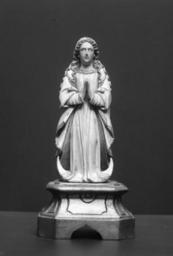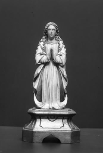 Keywords: Indian - The Virgin of the Immaculate Conception - Walters 71407.jpg The Virgin kneels on a crescent moon with her hands in an attitude of prayer Her head is uncovered and her hair falls down her back and in tresses over her shoulders In rendering the folds of the garments little concession has been made to anatomy A square paper label with blue borders on the under surface of the statuette is inscribed in ink 123 ca 1700 Baroque ivory traces of gilding cm 13 2 accession number 71 407 5423 William T / Henry Walters Collection Baltimore date of acquisition unknown by purchase Walters Art Museum Henry Walters Acquired by William T or Henry Walters place of origin Goa India Walters Art Museum license Baroque sculpture in the Walters Art Museum Sculptures from India in the Walters Art Museum Media contributed by the Walters Art Museum needs category review Media contributed by the Walters Art Museum needs artist update Sculptures from Goa 1700s works of India Kneeling in prayer in art |